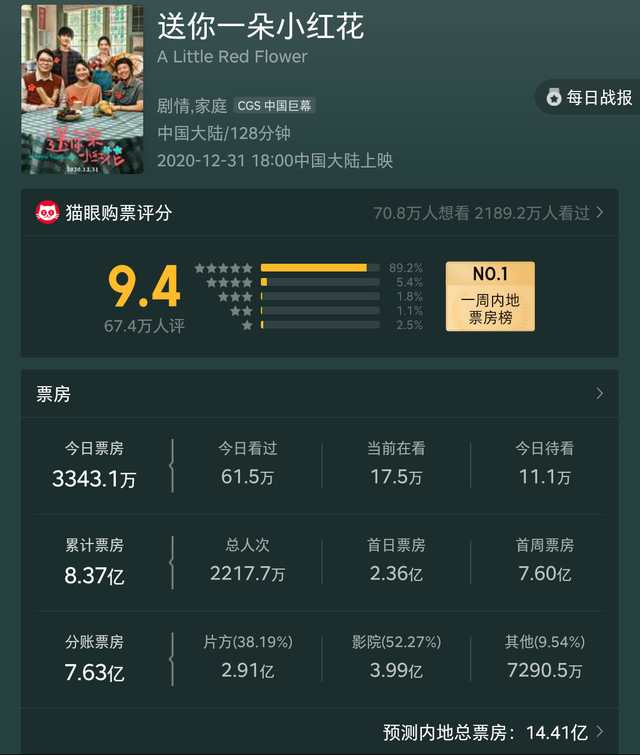 所以很有可能,《送你一朵小红花》会是新年第一部票房破10亿的电影。而且根据专业平台的预估,最终《送你一朵小红花》的票房会在14亿左右,《拆弹专家2》则是12亿左右。