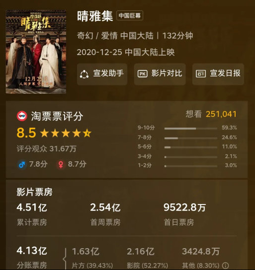 这部电影是在2020年12月25日上映,但在2021年1月5日电影就被影院下架,在十多天的放映中,《晴雅集》的总票房一共是4.5亿元。