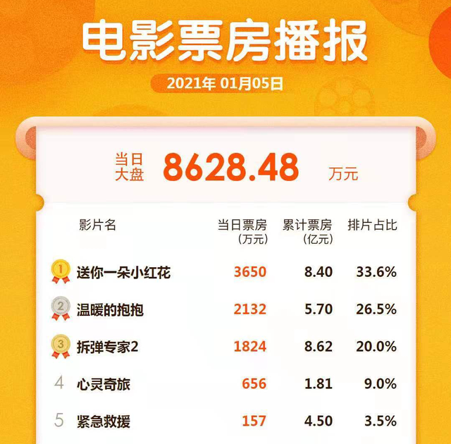 但前者可是比后者早上映整整一个星期,现在《送你一朵小红花》的排片率也明显更高,而且以1月5号的票房数据为参考,《送你一朵小红花》的单日票房是《拆弹专家2》的两倍。