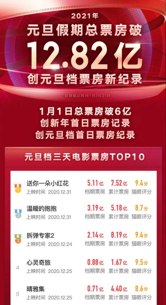从2020年12月31日上映开始,这部电影就一向是票房冠军,首日破2亿,三日破5亿,再到现在(7日)的8.4亿。