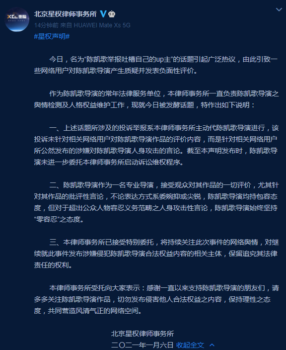 1月6日北京星权律师事务所发布声明回应了“陈凯歌举报吐槽自己的up主”的话题,称一些用户因此发生了对陈凯歌的质疑跟负面性评价,并且要对此事作出声明。