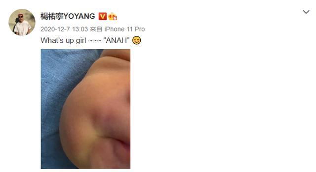 三个月后,杨祐宁在网上发文公布了未婚妻Melinda顺利生产的喜讯,并大方透露两人的孩子是个女儿,取名为anah。