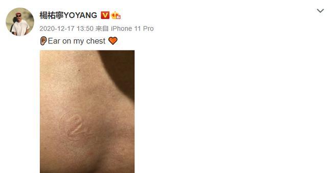 可以看得出来,新晋为奶爸的杨祐宁在女儿的陪伴下过得十分幸福,他还曾在网上晒出了女儿趴在他胸口留下的耳朵印子,发文表示:耳朵贴在胸口上,虽然只有简简单单的四个英文单词,但字里行间满满都是作为人父的满足与甜蜜。