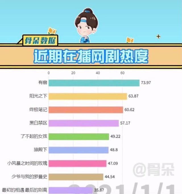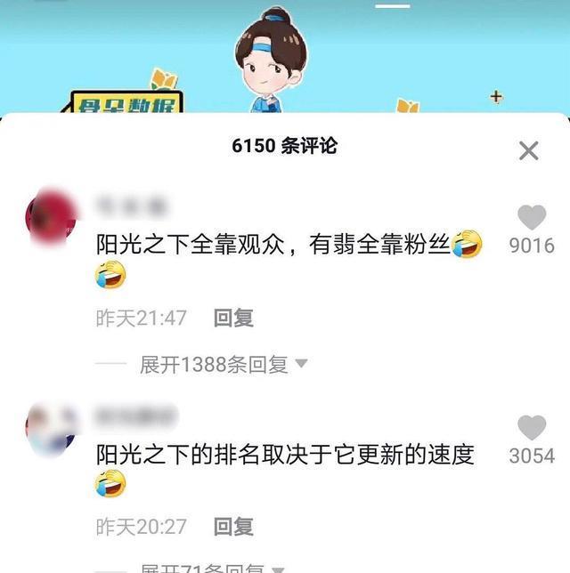 电视剧作品的热度,和观看的人数和好评率都互相关注,近期在播网剧热度排名已经新鲜出炉,网友是这样评价的,“《阳光之下》全靠观众,《有翡》全靠粉丝”。