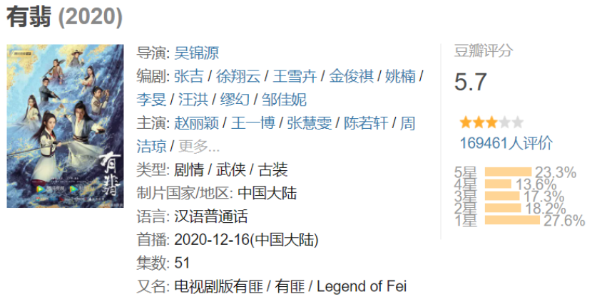 曾被第六届豆瓣年度榜单提名为“最值得期待的剧集”的《有翡》,截止到截稿前,在豆瓣拿下了5.7分的“不俗战绩”。