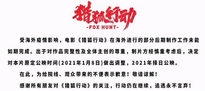 2021年1月5日晚,电影《猎狐行动》官宣改档:受海外疫情影响,《猎狐行动》在海外进行的部分后期制作工作未能如期完成。出于对作品完整性及全体主创的尊重,制片方经慎重考虑后,决定对本片原定公映时间(2021年1月8日)做出调整,2021年择日公映。