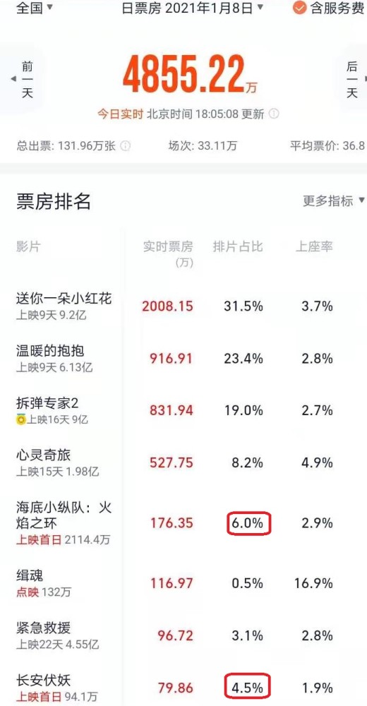 《海底小纵队:火焰之环》的排片只有6%,《长安伏妖》的排片只有4.5%,这哪像是新片的待遇啊?排片最高的还是《送你一朵小红花》《温暖的抱抱》《拆弹专家2》。易烊千玺和刘浩存主演的《送你一朵小红花》,票房已经反超了《拆弹专家2》,注定会成为这次贺岁档的冠军。
