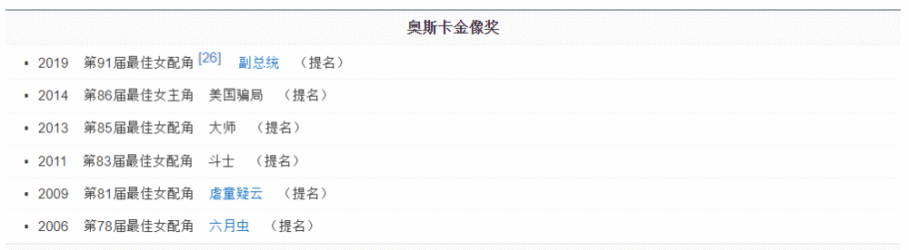 她至今六次提名奥斯卡小我奖项,全部未能中标。