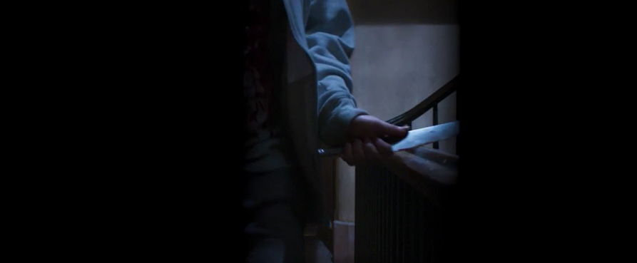 通过门缝看见,门外有人拿着刀往前走来。