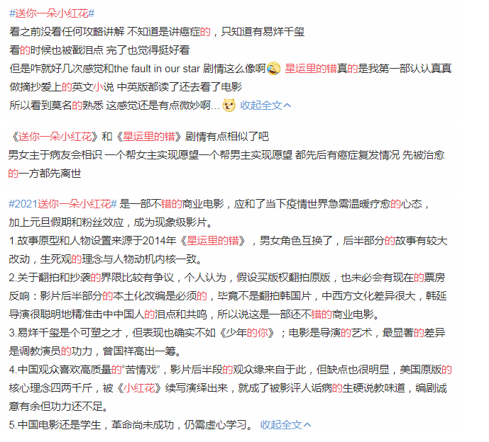 《送你一朵小红花》被传出来抄袭的嫌疑以后又被爆出来有注水的可能性。之前《送你一朵小红花》被网友爆料称与《星运里的错》剧情,还有人物以及内容都有很大的相似性,并且还罗列出来了一些相似之处。从这些相似之处可以看出来两部影片的相似性真的很高。