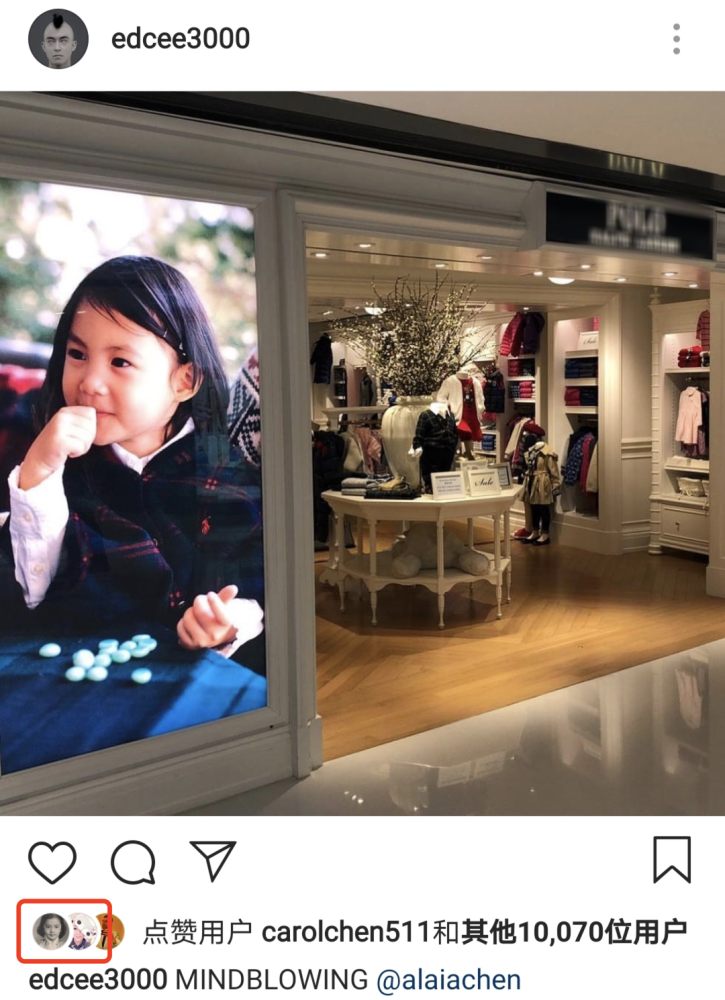 之前只是照片曝光,这次这些大片还被放到了商场的橱窗上。同样是在今天,陈冠希才刚晒出过女儿的广告牌,旁边是童装,而Alaia就是代言人。