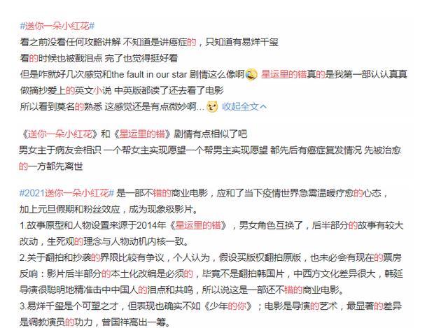 今年最大的赢家可以说是《送你一朵小红花》了吧,如果那件事没有被传出来的话。之前,《送你一朵小红花》正在热播的时候,被网友爆料称有抄袭《星运里的错》这部影片。