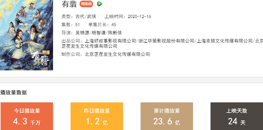虽然网络上说《有翡》不好看的人触目皆是,但是《有翡》的播放量是实打实的高,上线26天,播放量达到23.6亿,这是多少电视剧羡慕不来的成绩,如果他真的不好看,为何播放量这么高呢?