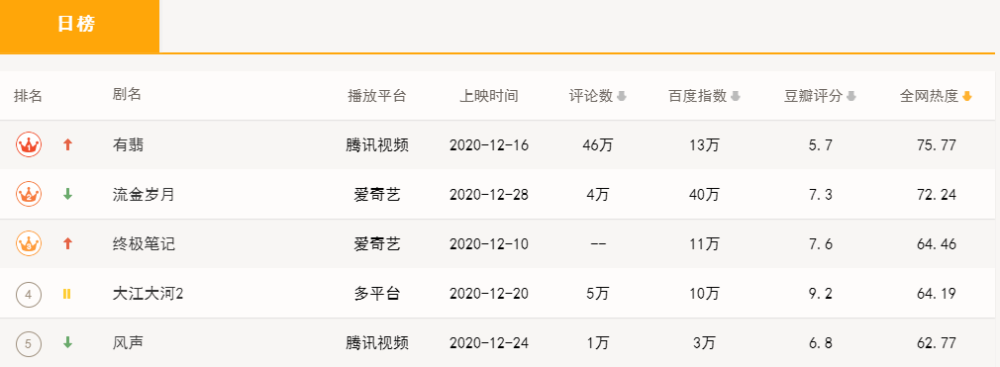 不但如此,自《有翡》上线以后,各个平台热度榜第一的一向都是《有翡》,无论是《流金岁月》还是《终极笔记》都无法和《有翡》相抗衡。王一博和赵丽颖主演的电视剧是真抗打。