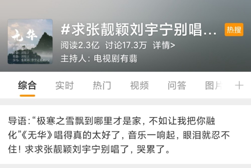 原来不是因为《无华》难听,而是太好听了,但是《无华》一出,必有大虐。周翡和谢允历经艰难险阻,终于互诉衷肠,定下终身,然后谢允居然身中剧毒?悲情的画面,配上伤感的歌曲,观众的眼泪就哗哗地流。不少网友发文想要捂住刘宇宁的嘴,让他不要再唱了。