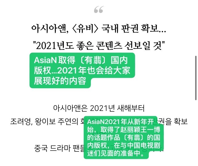 据悉,韩国电视台已经确定买入了《有翡》版权,采用网台双播的形式,而且采用中文原音,配韩语字幕。王一博和赵丽颖这是要火到韩国去了,一向以来我们国家都是引进韩剧,还有不少网友说国产剧不如韩剧。如今用事实表明,国产剧也能拍出这么好看的电视剧!