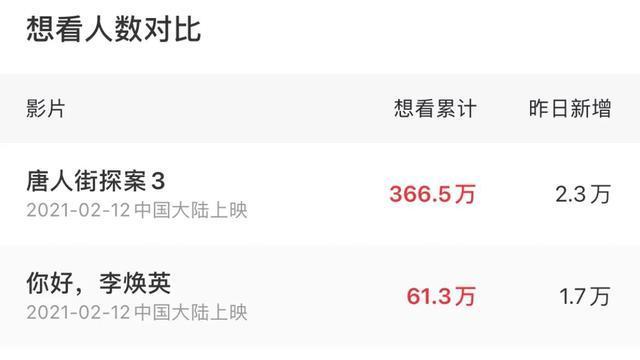 截止到现在,猫眼平台的数据显示,《唐探3》想看值已经达到了366万,是第二名与第三名想看值总和的4倍还要多,又是一个碾压的态势,似乎一切都在显示,陈思诚这次真的赌对了,2021年春节档的霸主即将发生。