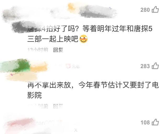 关于《唐探3》上映的一拖再拖,很多网友也是嗤之以鼻,很多人留言嘲笑“唐探4拍好了吗?等着明年过年和唐探5三部一路上映吧”。