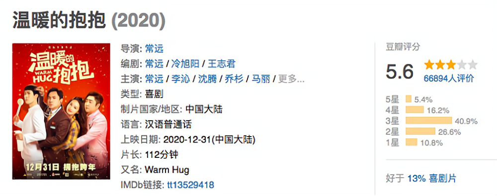 那么,作为现阶段唯逐一部喜剧电影,常远、李沁主演,汇聚沈腾、马丽、乔杉等喜剧大咖的《温暖的抱抱》,究竟差在了哪里?