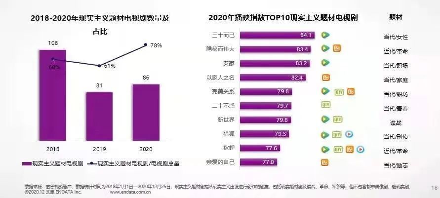 在《大江大河2》开播期间,《2020年电视剧调研报告》如期发布。据该报告可知,在广电总局鼓励现实主义题材剧创作的号召下,2020年现实题材电视剧超过20部,涵盖了都市、年代、职场、刑侦等类型,引领了整个卫视剧场。