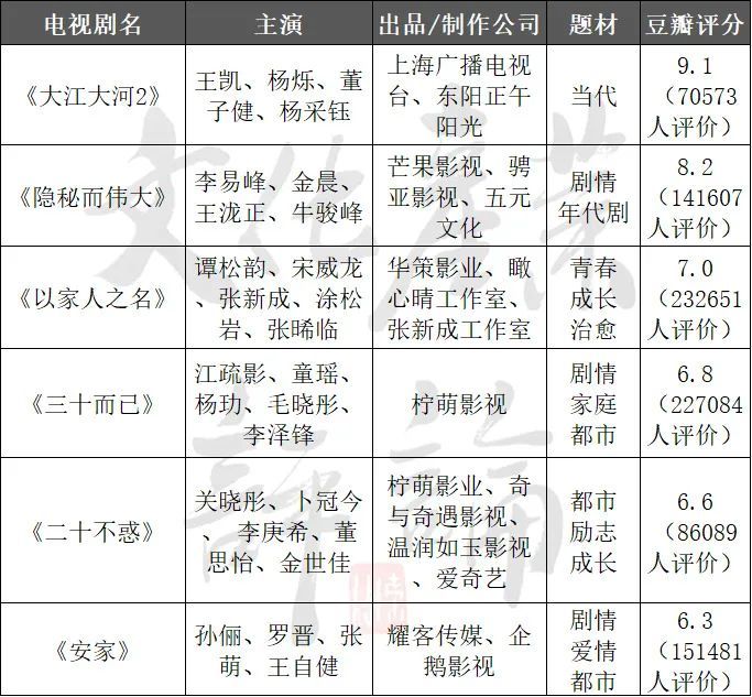 其中,《大江大河2》以豆瓣评分第一位的成绩暂列榜单之首。《隐秘而伟大》《以家人之名》《三十而已》《二十不惑》《安家》也成绩不俗,领衔了2020年的现实主义题材剧场。