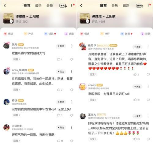 触动人心的曲目在酷狗歌曲评论区收获诸多好评:'温柔之中带着坚韧,真是车载斗量的佳作'、'听得非常磅礴大气'、'好有气势的一首歌,与剧也很配'。无数歌迷在此集结,为谭维维新歌疯狂打call;评论区还成为了剧迷追剧的重要阵地,积极分享听歌感悟,热议剧情发展进度。