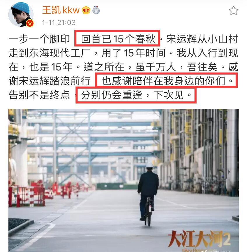 王凯发布长文告别宋运辉。他谈到了两个15年,一个是剧中的宋运辉从小山村到东海工厂用了15个春秋;一个就是自己出道15年,看起来不论是哪个15年都颇有缘分。最后他还提到了“分别仍会重逢,下次见”,再结合剧中很多问题以及人物都没有交代好,都没有圆满,看来真的还有《大江大河3》?