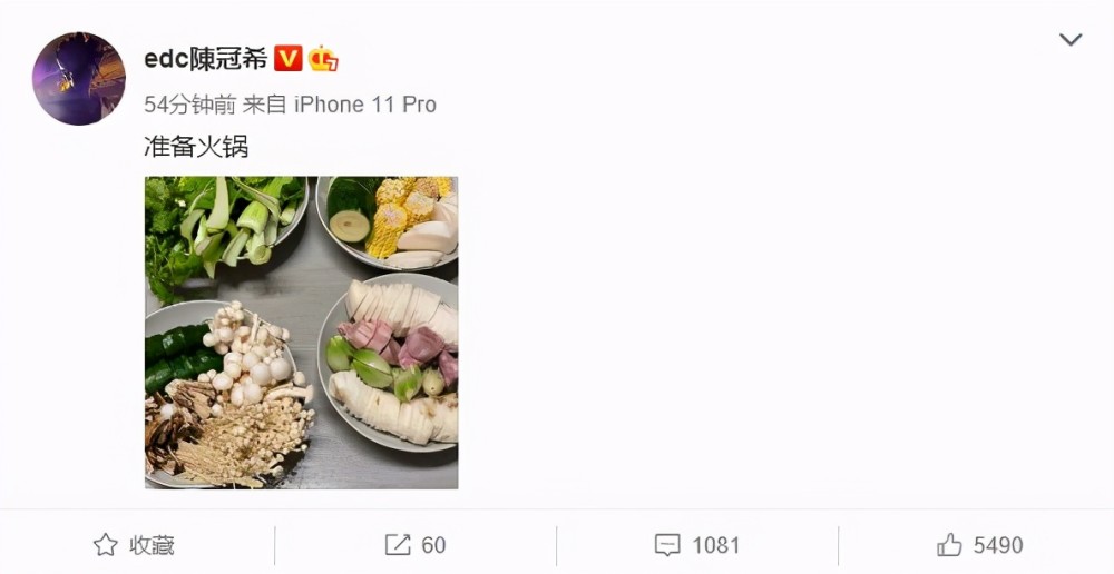 1月13日下昼,超人气偶像陈冠希通过微博,晒出了4盘分别装满差别的菜,并配文称“准备火锅”,引起了不少人的关注与热议。