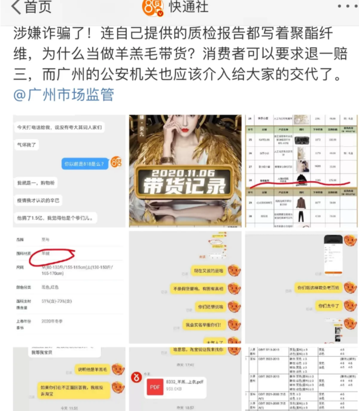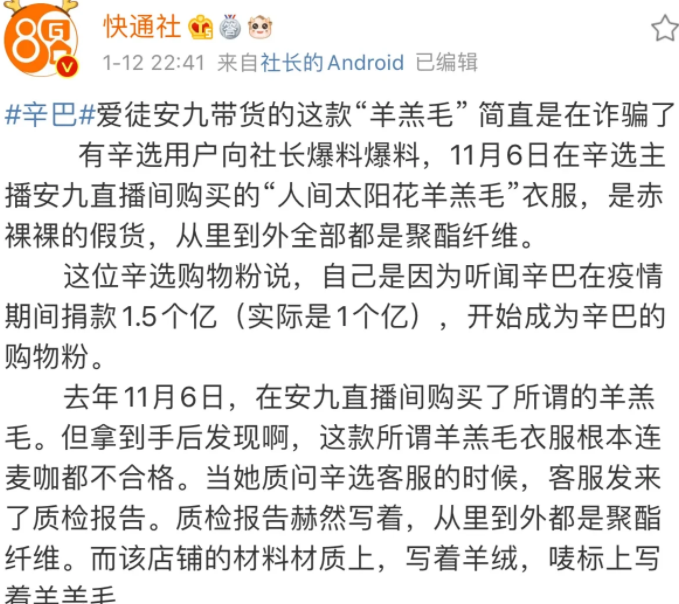 1,猫妹妹被封禁。2,安久带货量偏少才2000多万,还被消费者盯上要维权,据爆料,一名粉丝向社长爆料,她开始是听见辛巴捐款1.5亿,所以觉得辛巴很男人,所以成为他的粉丝,但是去年11月在辛巴旗下安久直播间买了所谓的羊羔毛衣服,但是发现都不是羊羔毛。