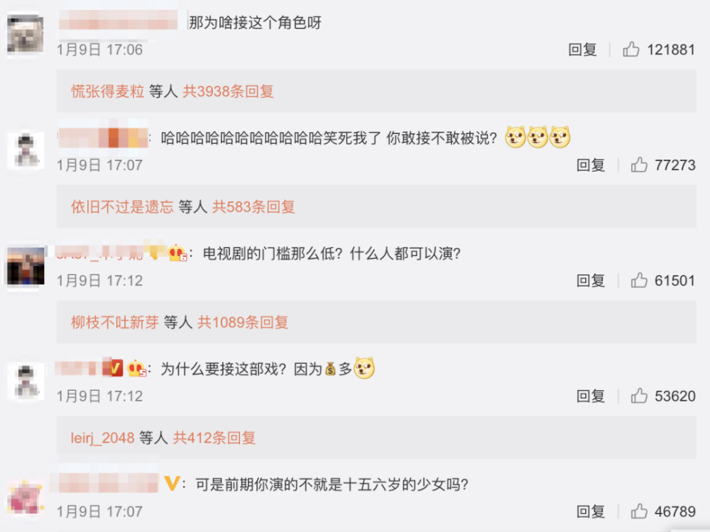 可惜,急着和剧方宣发割席的章子怡没能逃过观众的吐槽,微博下方的评论犀利又清醒:既然知道自己年龄分歧适,为何要接这个角色这部戏呢?钱难赚shit难吃,既然收下了巨额演出费,自然也别想着摘清自己了。