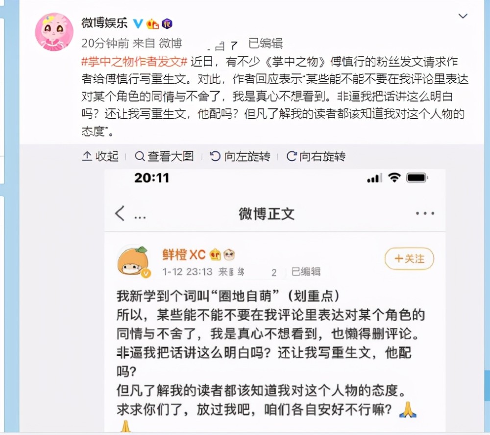 令观众和网友非常意外的是最近有不少《掌中之物》傅慎行的粉丝发文请求作者给傅慎行写重生文。对此,作者回应表示“某些能不行不要在我评论里表达对某个角色的同情与不舍了,我是真心不想看到。非逼我把话讲这么明白吗?还让我写重生文,他配吗?但凡领会我的读者都该知道我对这小我物的态度”。