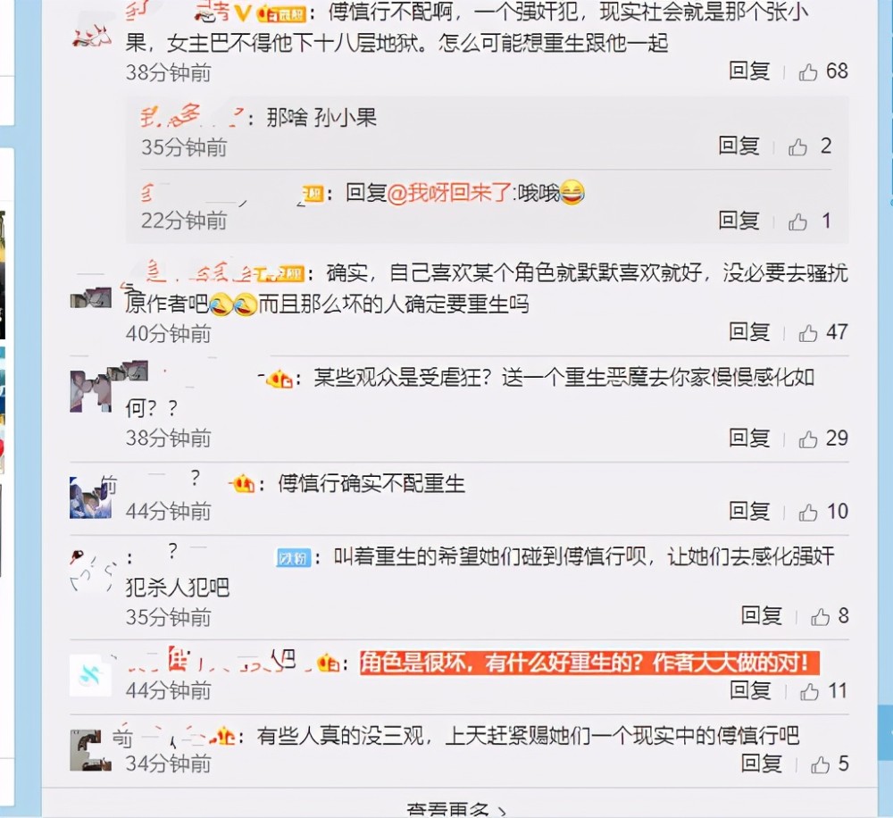观众和网友也纷纷留言评价道:傅慎行不配啊,一个强奸犯,现实社会就是那个张小果,女主恨不得他下十八层地狱。怎么可能想重生跟他一路。确实,自己喜欢某个角色就默默喜欢就好,没必要去骚扰原作者吧!而且那么坏的人确定要重生吗?有些人真的没三观,上天赶紧赐她们一个现实中的傅慎行吧!角色是很坏,有什么好重生的?作者大大做得对!