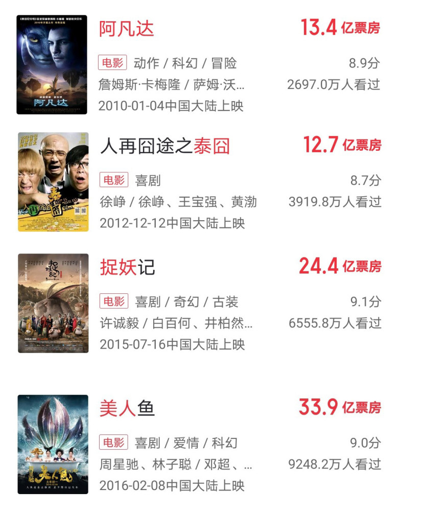 几个月后,来到2016年的春节档,周星驰导演的《美人鱼》,再次让人见到了“周星驰”三个字在电影圈的影响力,33.9亿的票房再次打破国内电影记录。