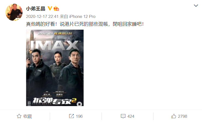 《拆弹专家2》票房火爆,品质过硬,一部港片还远远不敷。在观众的心中:港片未死,也不成能死去!就像王晶在首映礼上爆粗口似的宣泄:真他妈的好看!说港片已死的那些混账,闭嘴回家睡吧!