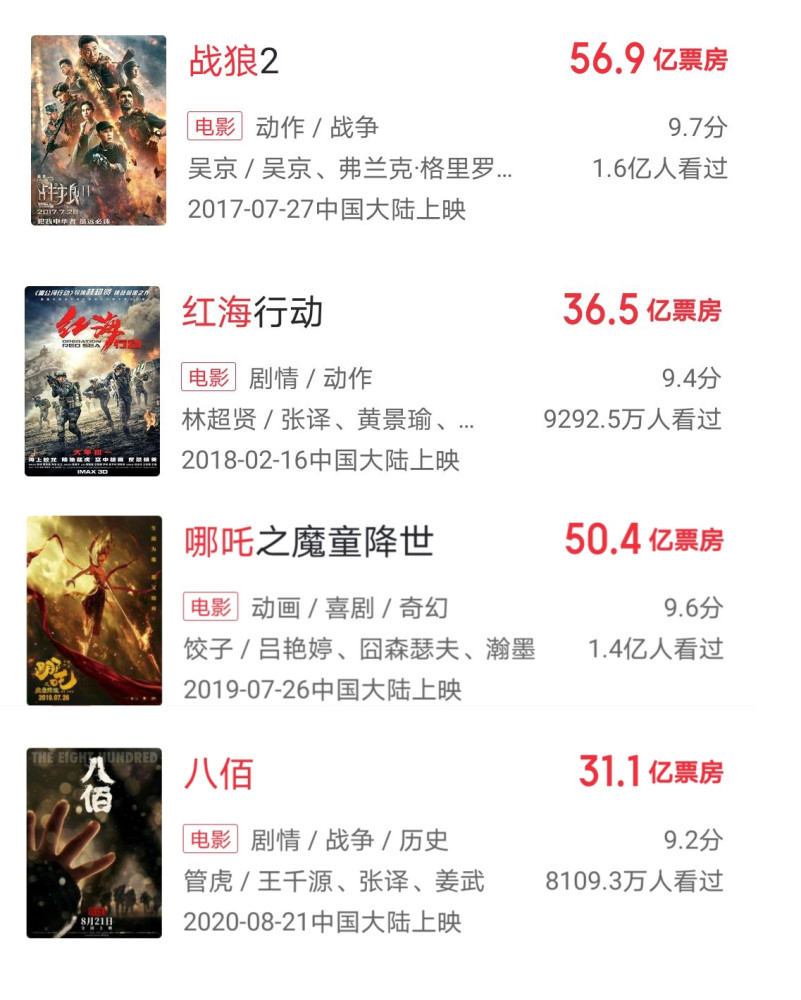2017年暑期的《战狼2》直接把票房冲到了50亿元之上,最终票房定格在56.9亿元。2018春节档的《红海行动》在不被看好的情况下,从第四逆袭到第一,票房高达36.5亿元。