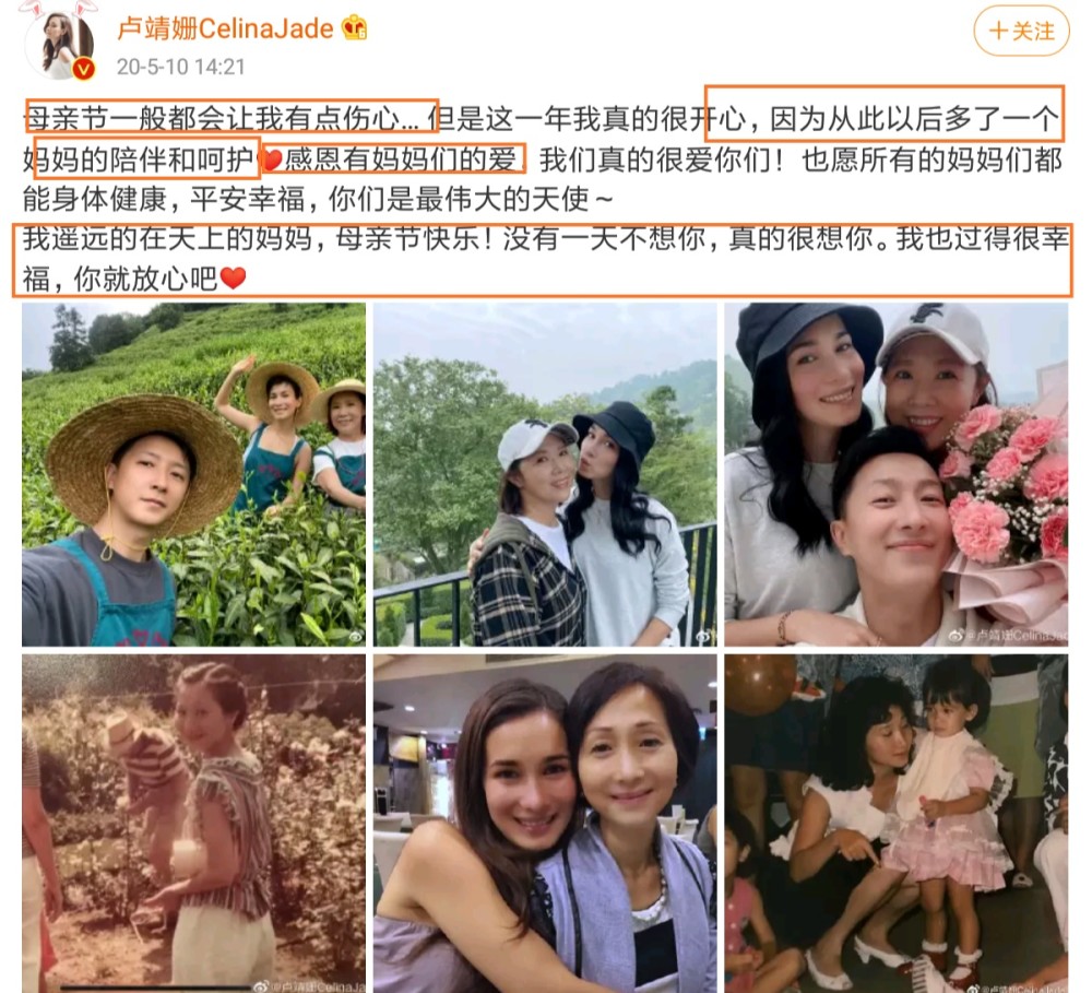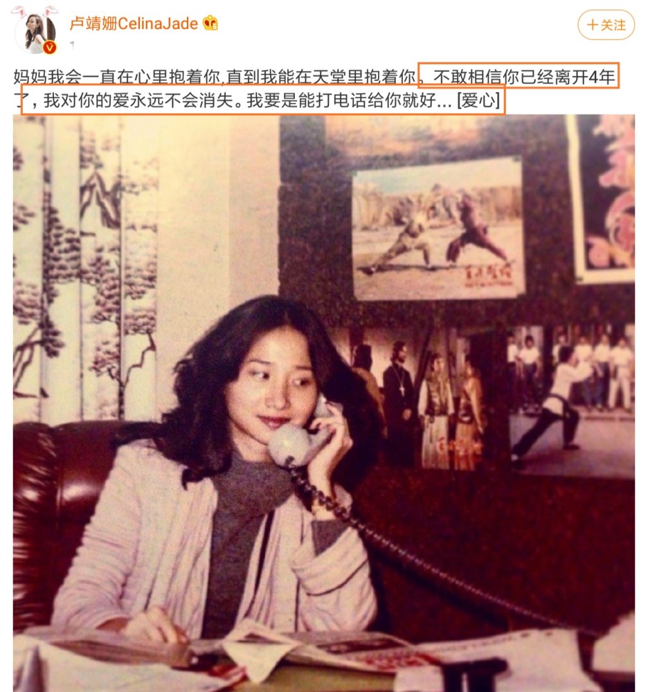 1月13日,卢靖姗在社交平台上面更新一则状态,正文中卢靖姗这样写道:妈妈我会一向在心里抱着你,直到我能在天堂里抱着你。不敢相信你已经离开4年了,我对你的爱永远不会消失,我要是能打电话给你就行了。