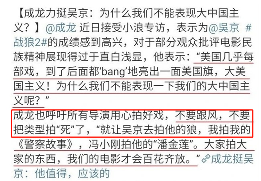 《战狼2》这部电影老少皆宜,有许多激动人心的大场面,也弘扬了主旋律,激发了观众们的爱国情怀。可是在这部电影爆红以后,许多人开始跟风拍摄同样的题材,后果就是精雕细刻的作品增多,市场里的爱国电影过度饱和,观众们也已经看腻了。对此成龙就劝阻大家:“不要跟风,不要把同一类型的电影拍死了。”