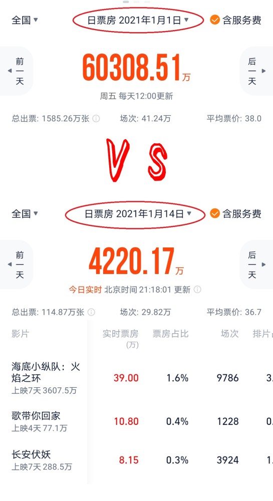 2021年元旦节票房vs1月14日票房