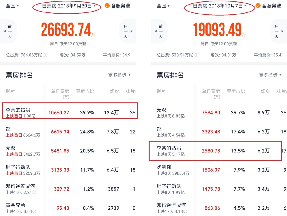 《李茶的姑妈》2018年国庆节期间票房走势