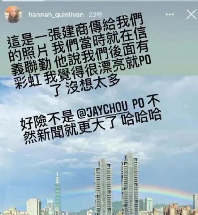 但是最近一段时间,关于周杰伦和侯佩岑的报道却突然多了起来,事情的起因还是源于很久之前的一张彩虹照片。当时侯佩岑在Ins上发了一张自己家里窗户外面的彩虹,没想到时隔两个月后,同样的照片居然出现在昆凌的IG,所以当时曾经引起了轩然大波。