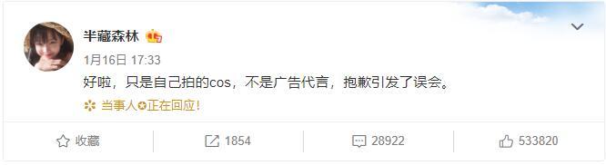 过后,半藏森林曾发文回应此事,称自己没接广告,只是cos,但即便如此,依旧没平息外界心中怒火,对其怒骂愈演愈烈,这才令她今天发长文控诉网络暴力。