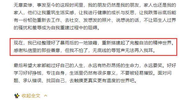面对网络暴力,半藏森林表示今后不会再怕了“我已经整理好了暴雨后的一地狼藉,重新搭建起了完整自洽的精神世界。无底线的辱骂声已经无法再入我耳”