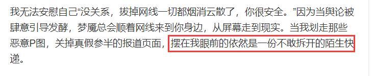长文中半藏森林总结了过去曾遭受的种种网络暴力,还表示今后将不会被这些轻易摧毁,其中值得一提的是,谈及遭受网络暴力,她自曝曾被寄过不明快递,令人细思极恐。她透露曾被恶意P图,被侵犯肖像隐私权,还表示曾收到过一份不敢拆开的陌生快递,疑似黑粉所为,令人细思极恐,其中更有爆料称,还有人专门租了半藏森林对面的房子,疑似监视她的一举一动,更是令人起鸡皮疙瘩。