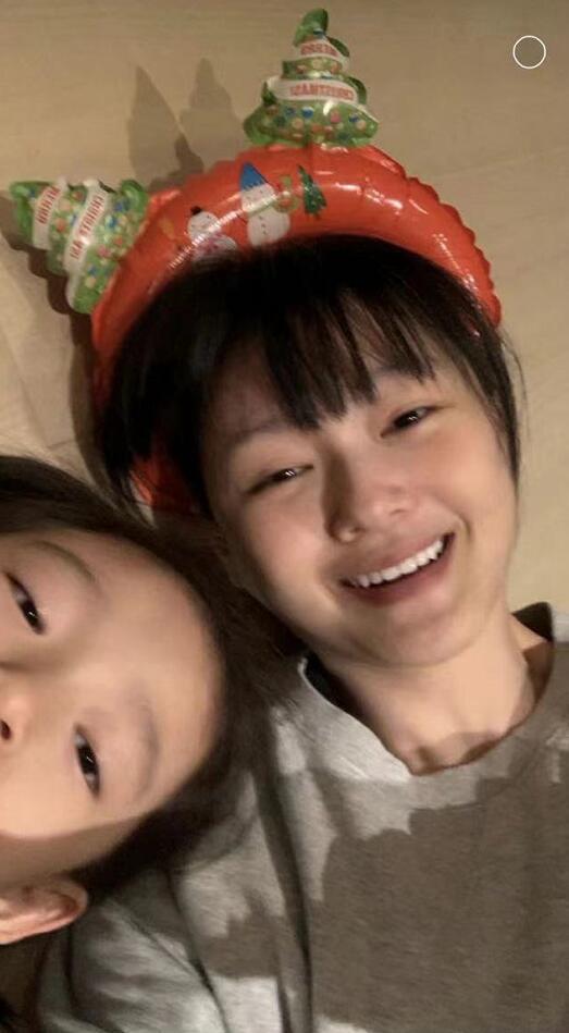 她留着齐刘海,穿着灰色上衣,头戴卡通发箍,露出灿烂笑容,看起来少女感十足。女儿小玥儿靠在妈妈的身边,眉眼与妈妈超像,未来必然也是大美人。