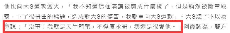 1月3日身在家中的大S因为蔡康永在节目上的发言,又无辜躺枪。被网友吐槽对人要求太过苛刻,不把人当人看。对此,大S看到消息,也高情商回应,直言自己本就是天生箭靶,不怪康永哥,还是很爱她。