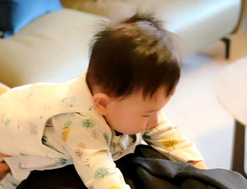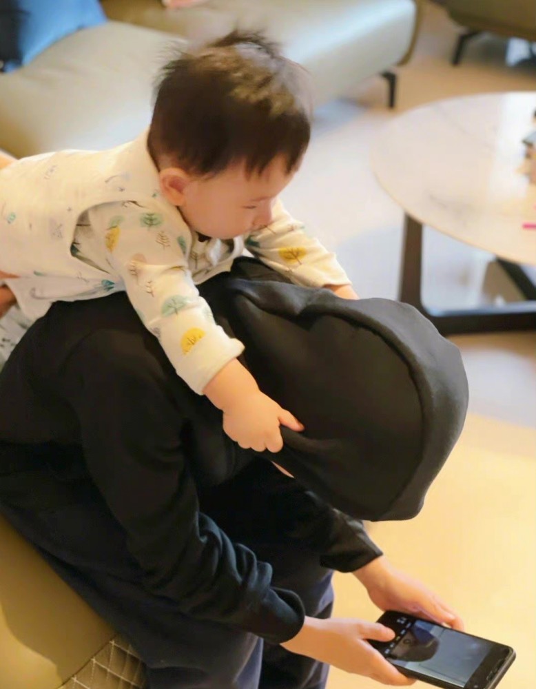 Hoho在家人的帮助下,爬到了哥哥身上,他穿着睡衣跟小背心,一双肉肉的小手紧紧抓着哥哥的帽子,露出侧脸,十分可爱。