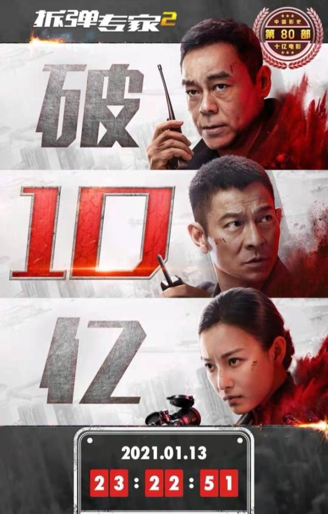 截止到一月十三号晚11点22分,由邱礼涛导演,刘德华 、刘青云、倪妮领衔主演的警匪犯罪片《拆弹专家》2的内地票房正式突破十亿票房大关。凭此成绩,该片不但成为了“中国影史”第80部十亿级别的电影,而且也成为第五部内地票房超十亿的“香港电影”!
