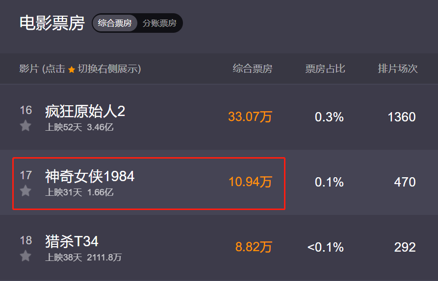 截止发稿,《神奇女侠1984》上映31天,总票房仅1.66亿,单日票房只剩下10万,全国排片场次只有470场,这跟下架没有啥区别,毫不夸张地说,《神奇女侠1984》已经扑街了,而且还是票房口碑双扑街,啥也没赚到。