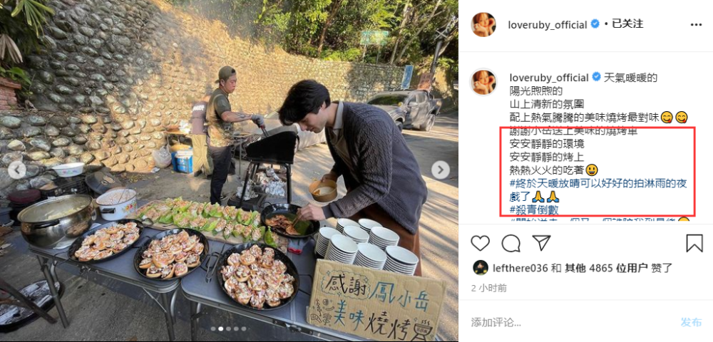 林心如的新戏《华灯初上》即将杀青,今日凤小岳给剧组送烧烤应援,林心如也感慨马上杀青了,大家一个接一个离开剧组,大家陆续离开十分舍不得,趁着新戏尚未杀青,大家为林心如过了个幸福的生日。