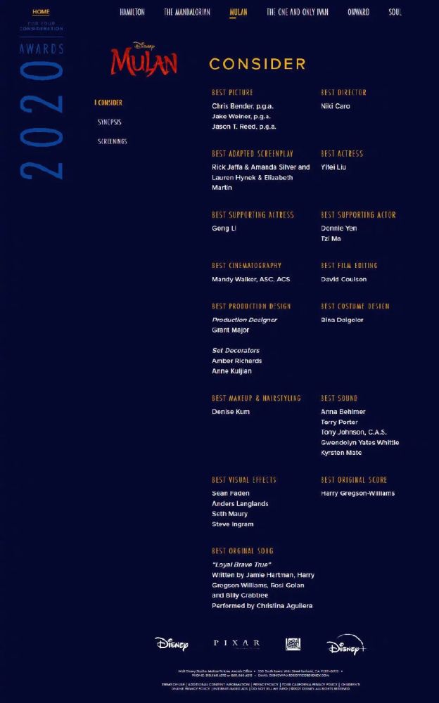迪士尼颁奖季官网曝光《花木兰》的本届奥斯卡计划,其报名的奖项有15个:最佳影片、最佳导演(妮基·卡罗)、最佳女主角(刘亦菲)、最佳女配角(巩俐)、最佳男配角(甄子丹、马泰)、最佳改编剧本(Rick Jaffa、Amanda Silver、Lauren Hynek & Elizabeth Martin)、最佳摄影(曼迪·沃克)、最佳剪辑(David Coulson)、最佳艺术指导、最佳戏服设计(Bina Daigeler)、最佳妆发(Denise Kum)、最佳音响、最佳视效、最佳原创配乐(Harry Gregson-Williams)、最佳原创歌曲(《Loyal Brave True》)。